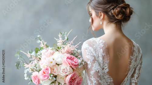 © stock.metket.com, Naklejka premium A bride with her back turned, elegantly holding a bouquet of pink and white flowers