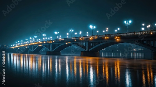 Naklejka premium A bridge at night, with bright streetlights glowing along its length,...