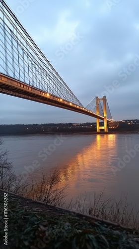 © Light, Fototapeta premium A bridge illuminated at dusk, reflecting on calm waters below.