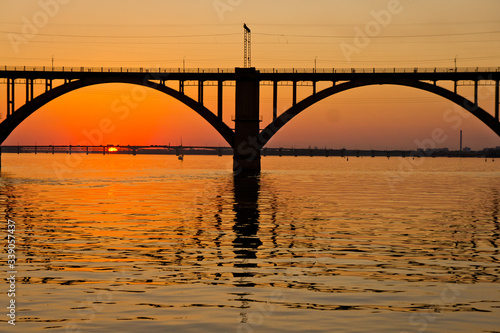 © Pavlo, Fototapeta premium A bridge on a river lit by the sun at sunset. Evening river landscape.