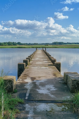 © vefimov, Naklejka premium A bridge over a body of water with a cloudy sky in the background. The bridge is old and has a rustic appearance