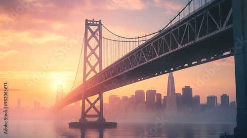 © Ibnu, Fototapeta premium A bridge over a foggy cityscape at sunrise