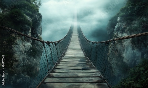 © panumas, Obraz premium A bridge over a river with a foggy sky in the background. The bridge is made of wood and is suspended over a deep ravine. Scene is mysterious and serene