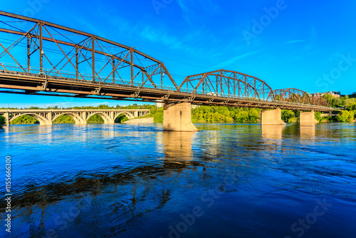 © Scott Prokop, Fototapeta premium A bridge spans a river with a blue sky in the background