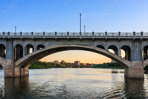 © Scott Prokop, Fototapeta premium A bridge spans a river with a city in the background