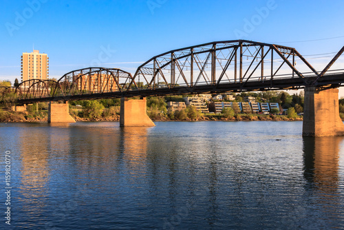 © Scott Prokop, Fototapeta premium A bridge spans a river with a city in the background