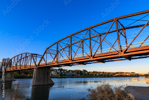 © Scott Prokop, Obraz premium A bridge spans a river with a clear blue sky in the background