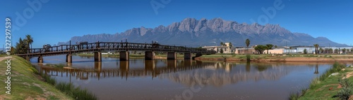 © kornc, Fototapeta premium A bridge spans a river with a mountain in the background