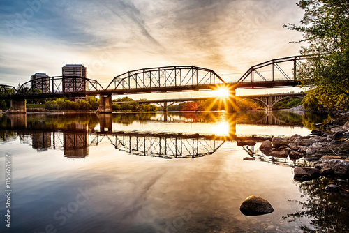 © Scott Prokop, Naklejka premium A bridge spans a river with a sunset in the background