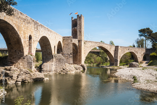 Fototapeta premium A bridge spans a river with a view of a castle in the background