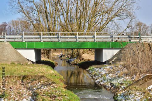 © W Korczewski, Fototapeta premium A bridge that connects the two banks over a small stream on a cool spring day.