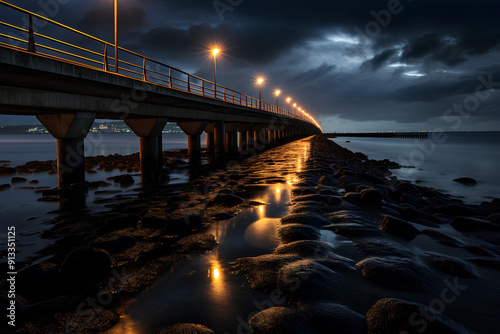 © Assyifa, Fototapeta premium a bridge that goes straight towards the sea at night when it rains