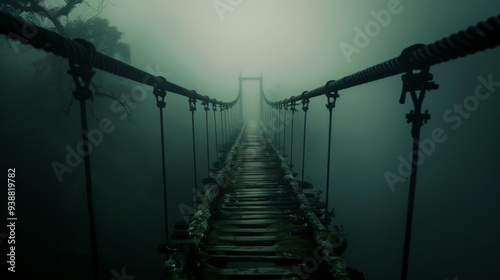 © Image-Love, Obraz premium A bridge with a foggy sky in the background. The bridge is old and has a wooden walkway