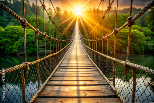 © Butsarakham, Obraz premium A bridge with a rope bridge over a river. The bridge is surrounded by trees and the sun is shining on it