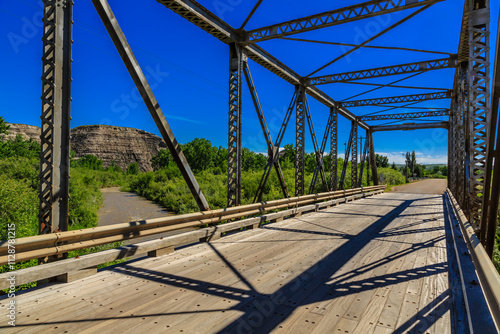 © Scott Prokop, Fototapeta premium A bridge with a view of a forest and a mountain in the background