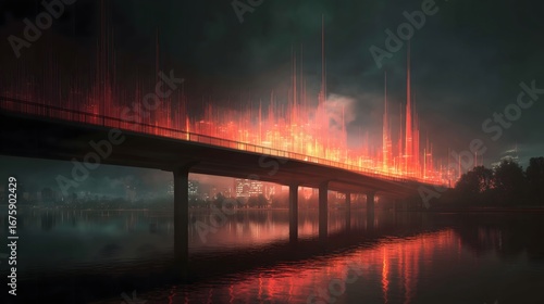 © W, Obraz premium A bridge with lights on it is lit up at night. The lights are scattered across the bridge, creating a beautiful and serene atmosphere. The bridge spans across a body of water