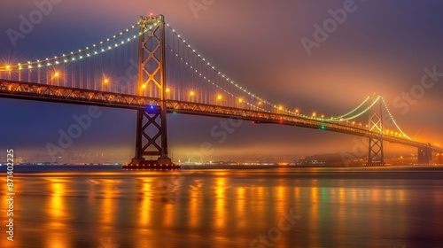 Fototapeta premium A bridge with lights on it is reflected in the water