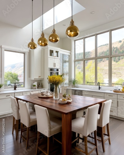 Obraz premium A bright, airy modern farmhouse kitchen with a large island featuring a rich walnut wood top