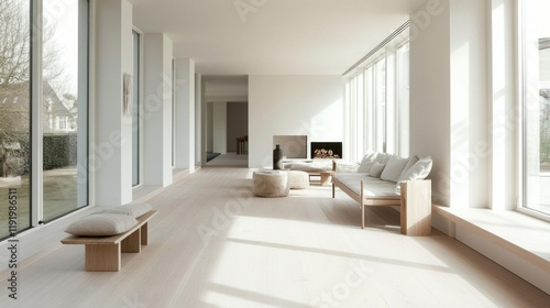 Fototapeta premium A bright and airy Nordic living room with large windows, white walls, and minimalistic furniture, showcasing a harmonious blend of comfort and simplicity in design.