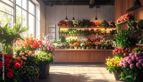 Fototapeta premium A bright and colorful flower shop, filled with vibrant bouquets and plants, bathed in natural light.