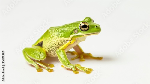 © Damerfie, Naklejka premium A bright and detailed close-up shot capturing the vivid colors and textures of a green frog against a stark white background