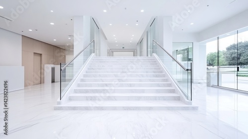 Obraz premium A bright and modern building lobby featuring a wide white marble staircase with glass railings.