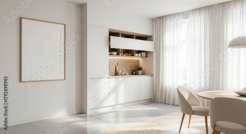 © SHALENA, Fototapeta premium A bright and modern minimalist kitchen and dining area with clean lines, white cabinets, and a round table with chairs