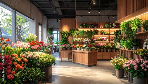 Fototapeta premium A bright and spacious floral shop displays a vast array of colorful flowers and plants, arranged attractively on wooden shelves and displays.