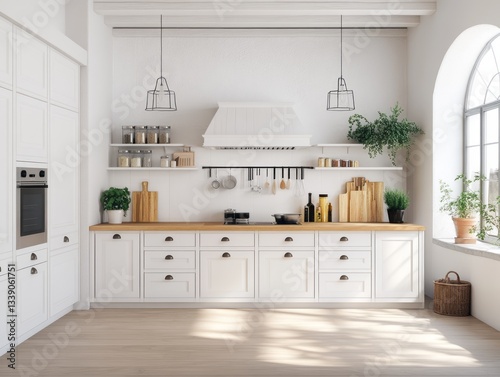 © RaksaLinggo, Fototapeta premium A bright and spacious white kitchen with wooden countertops and plants