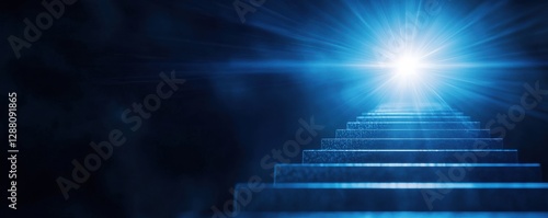 © Nopadon, Obraz premium A bright blue light illuminates a staircase, creating a mystical atmosphere that invites curiosity and wonder.