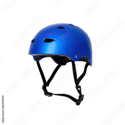 © Fiz's magic, Fototapeta premium A bright blue protective helmet with adjustable straps and ventilation holes isolated on white background