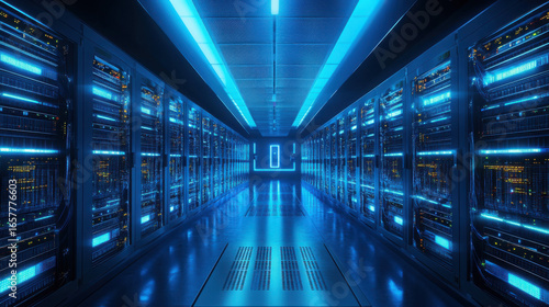 Fototapeta premium A bright blue server room with rows of server racks and glowing lights illuminating the long corridor