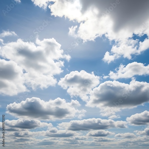 © Soffa, Obraz premium A bright blue sky is dotted with puffy white clouds, showcasing a beautiful and serene day.