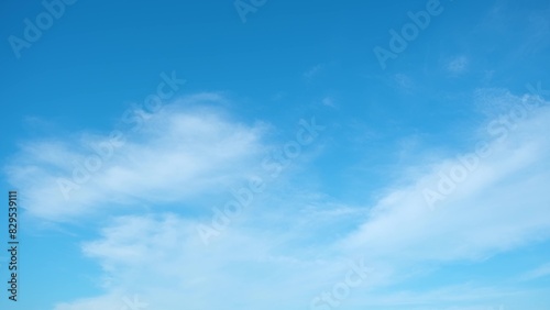 Fototapeta premium A bright blue sky with a few wispy white clouds scattered across it. The clouds have a soft, fluffy appearance, creating a serene and peaceful atmosphere. Blue sky background.