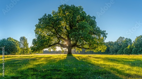 Fototapeta premium A bright, clear photograph of a majestic oak tree in a green meadow under a...