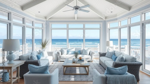 © Sanook, Fototapeta premium A Bright Coastal Living Room with Soft Blue and White Decor, Nautical Elements, and Expansive Ocean Views