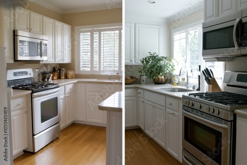 Fototapeta premium A bright, contemporary kitchen features white cabinetry and stainless steel appliances, offering a clean and elegant space for cooking and family gatherings.
