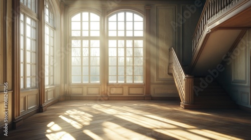 Obraz premium A bright, empty room with tall windows and a staircase leading to another level.