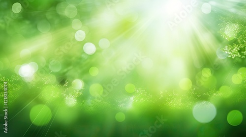 © Waa, Fototapeta premium A bright, ethereal green background with soft bokeh effects and light rays.