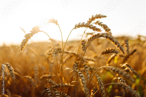 © maxbelchenko, Obraz premium A bright field of ripe wheat against a blue sky at sunset. An agricultural field with a rich harvest of wheat. Golden ears of grain flutter in the wind. Concept of nature and agriculture.