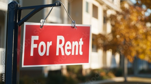 Obraz premium A bright "For Rent" sign hangs in front of a residential building, indicating...