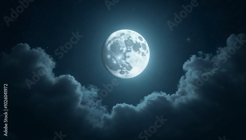 Fototapeta premium A bright, full moon glowing in a starry night sky with dark clouds drifting...