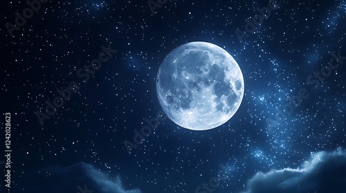 © Background, Fototapeta premium A bright full moon illuminates a starry night sky, surrounded by clouds.
