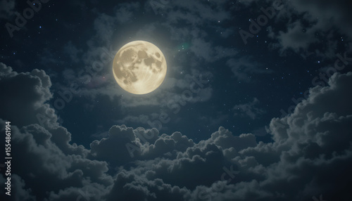 © Kiki, Fototapeta premium A bright full moon shines brightly in a dark, cloudy night sky.