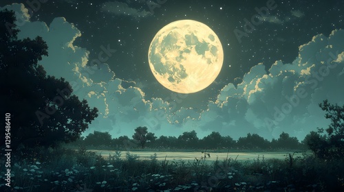 Fototapeta premium A bright full moon shining over a tranquil night landscape
