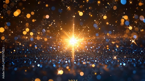 Naklejka premium A bright golden star shines in the dark, surrounded by glittering sparkles. The year 2025 is written below.