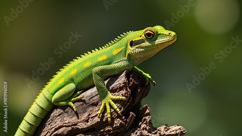 Fototapeta premium A bright green anole lizard perched on a weathered tree trunk, scaly body...
