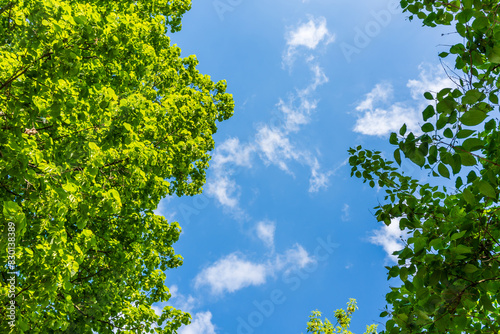 Obraz premium A bright green canopy of leaves and a blue sky