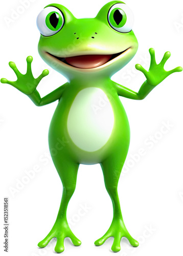 © ALDO, Naklejka premium A bright green, happy frog, rendered in 3D style, stands tall with a broad smile and welcoming pose.