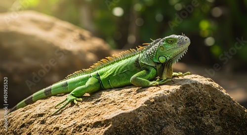 Fototapeta premium A Bright Green Iguana Sunbathing on a Rock, Its Scales Shimmering in the Warm Morning Light